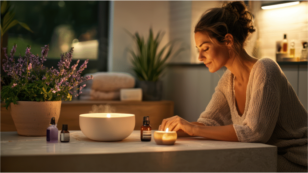 - Światło i zapach. Zamiast ostrego górnego światła — jedna lampka o ciepłej barwie. W tle jeden zapach (roślinny lub cytrusowy) — stały aromat kojarzony z relaksem działa jak przełącznik „trybu odpoczynku”. Pamiętaj o bezpieczeństwie świec i krótkim wietrzeniu po zakończeniu.